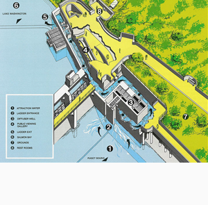- An elegant cutaway diagram of a fish ladder clearly shows spatial relationships.