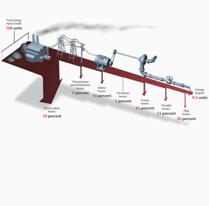 A 3d Sankey diagram both illustrates the process of energy transfer and emphasizes the point: that 90% of energy extracted from the ground is lost before it can be used.